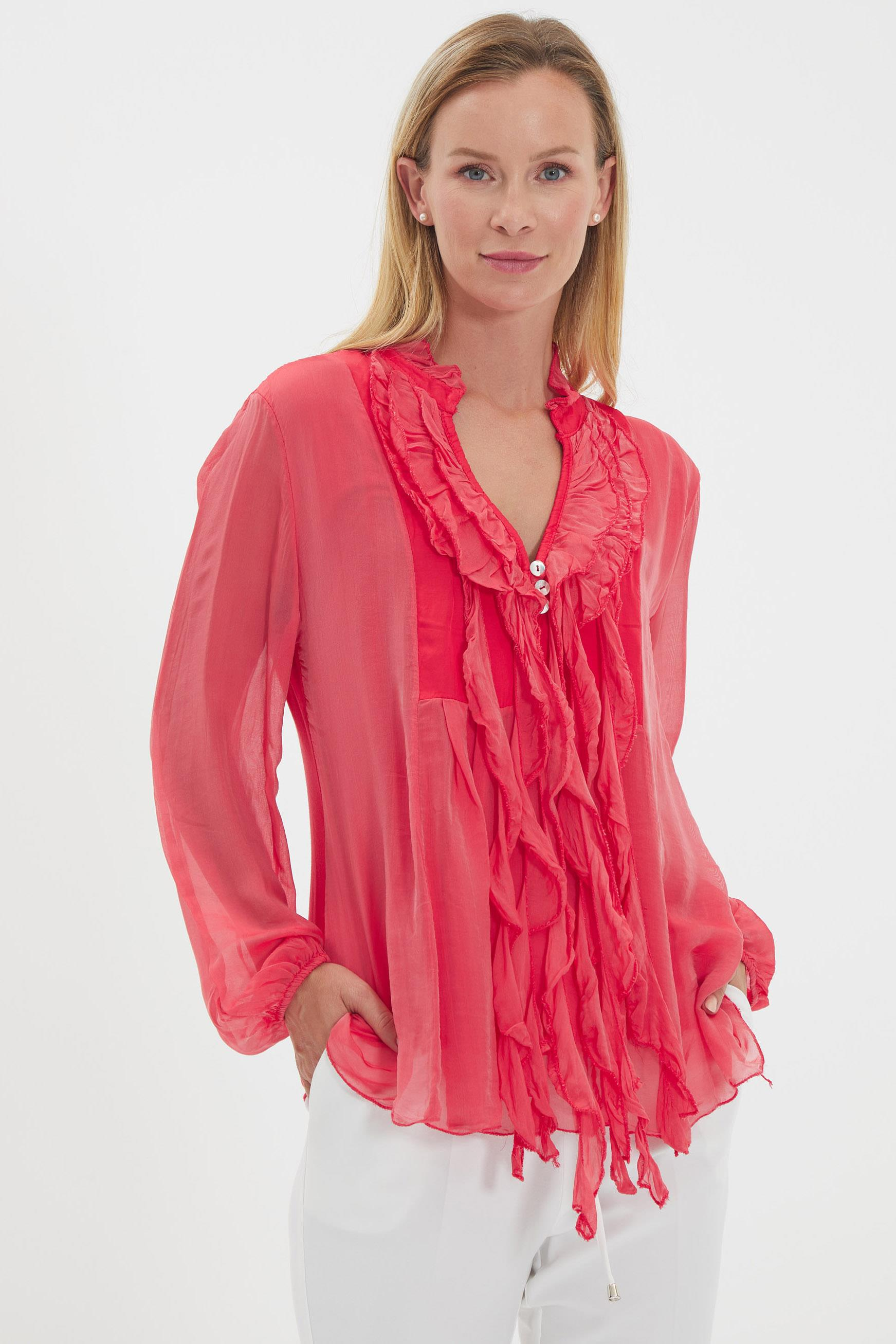 8603 Düğme detaylı fırfırlı ipek bluz- Pembe