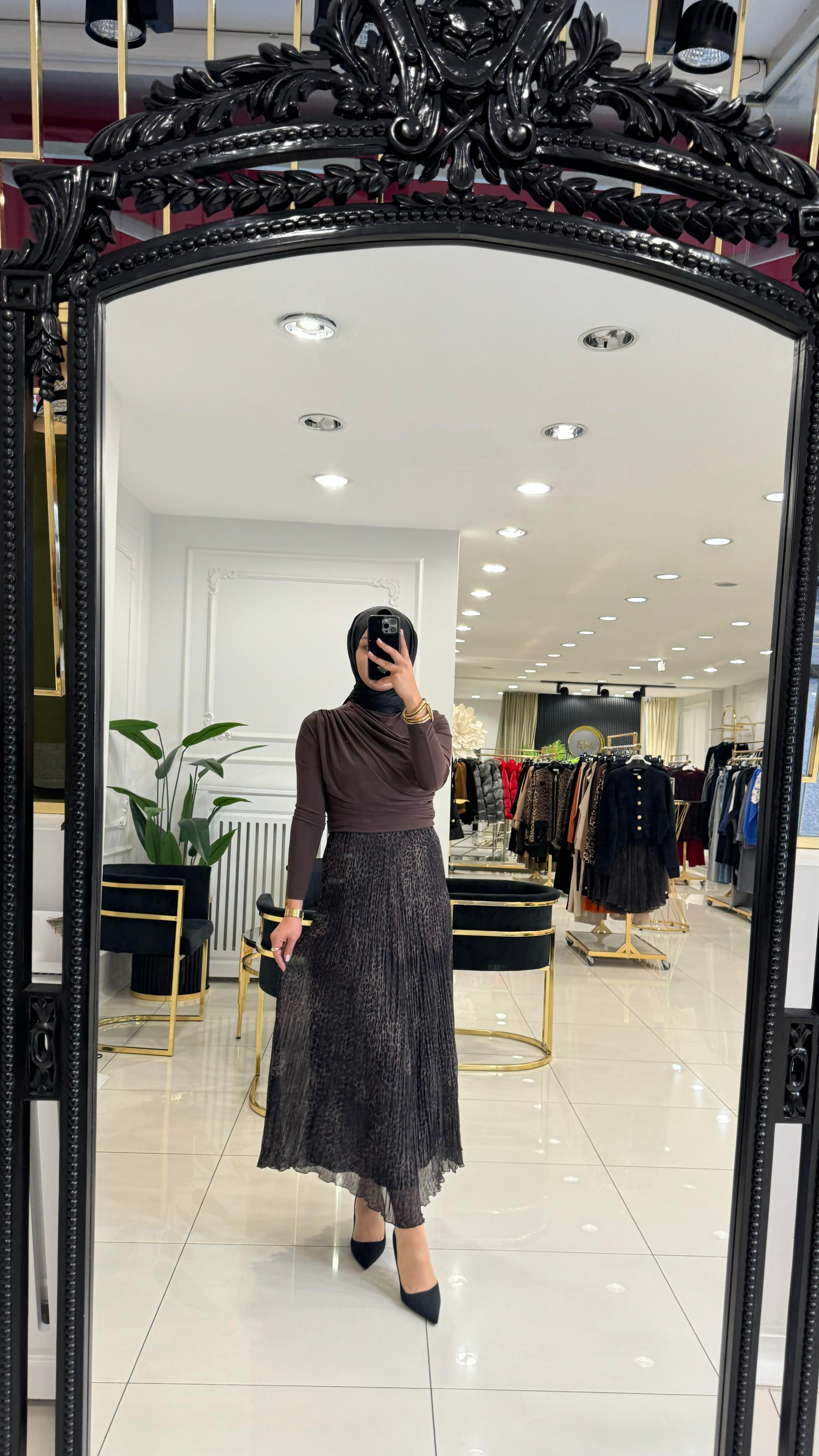 SZ-5432 Leopar şifon kırıştırma etek-KAHVERENGİ (K25ET001)